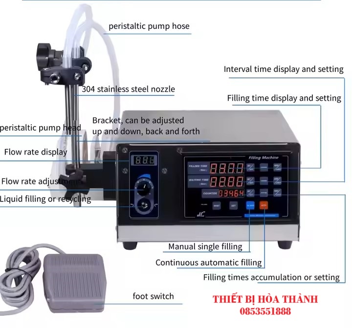 2. Tự Động và Thủ Công Kết Hợp: Người vận hành có thể đưa chai lọ vào vị trí chiết rót, sau đó bấm bàn đạp máy tự động thực hiện quá trình chiết rót dựa trên khối lượng hoặc thể tích đã cài đặt.